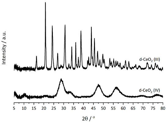 Thermal decomposition of the precipitated catalyst precursors were analysed using TGA-DTA (Figure 2a,b). Around 7% mass loss was observed from the d-CeO2 (IV) sample over the range 100–500 °C. In contrast, the d-CeO2 (III) sample showed a mass loss of 23% with a small decrease around 70 °C, followed by a sharp decrease between 250–300 °C. These were associated with the evolution of H2O species and decomposition of carbonate species from the dried sample respectively; confirming that the precipitate formed from the CeIII precursor was a Ce(CO3)x(OH)y type species [29]. Furthermore, the endothermic peak around 250 °C, characterised by DTA, is attributed to the liberation of CO2 from the decomposition of carbonate species [30]. The broad endothermic peak observed between 50–250 °C, in the d-CeO2 (IV) sample, can be attributed to the evolution of H2O. Previous work carried out by Hirano et al. looked at the precipitation mechanism of different CeIV and CeIII precursors using urea prepared by hydrothermal synthesis [31,32]. They discovered that when using a CeIV precursor, hydrated [Ce(OH)y(H2O)n-y](4−y)+ ions were formed as a result of the ability to undergo strong hydration from the lower basicity and higher charge of the Ce4+ ion. This caused CeO2.nH2O to precipitate rapidly before reaction with carbonate to form Ce(CO3)x(OH)y type species could occur. Evidence of CeO2 nanoparticle formation from the hydrolysis of ammonium cerium nitrate in aqueous solution without the addition of a base has also been documented by Pettinger et al. [33]. This effect was not observed when using different CeIII precursors, and the products formed were the carbonates, either Ce2O(CO3)2.H2O or Ce(OH)CO3 [31].