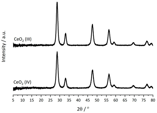 Data acquired from XRD analysis of the two catalysts shown in Figure 6 indicates a similar bulk structure. XRD patterns of the catalysts only showed the cubic fluorite structure of CeO2, with the lattice parameters of both catalysts within 0.0001 nm of each other. This is also consistent with the structure identified by selected area electron diffraction (SAED) analysis (Figure 5a,d). The crystallite sizes were calculated using the Scherrer equation by taking an average of the values obtained when analysing the peak widths of the four dominant (111), (200), (220), and (311) reflections. The sizes calculated were similar for both catalysts, with the CeO2 (IV) catalyst having a slightly smaller crystallite size on average (8.7 nm verses 9.3 nm, Table 1). However, the average crystallite sizes calculated are within the experimental error (±1.2 nm), hence no significant difference can be identified.