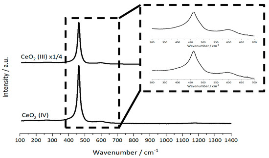 It is well established that CeO2 catalysts exhibit an intense Raman band around 460 cm−1, relating to the F2g vibrational mode. Other weaker bands are active, such as a band around 600 cm−1, which is associated with the presence of defect sites [36]. It has been previously established that the ratio of these two peaks can be used to estimate the concentration of defect sites in the material, which can then be used to greater understand the redox properties and oxygen mobility through the lattice of these types of catalysts [37]. This factor is especially important for propane total oxidation as it is thought that it takes place via a Mars-van Krevelen mechanism [12]. The Raman spectra shown in Figure 7 matches that of the cubic fluorite CeO2 structure, consistent with that determined by XRD. The intense band at 463 cm−1 denotes the F2g vibrational mode, and a small band around 590 cm−1 indicated the presence of some defect species. The ratio of bands at 590 cm−1 and 463 cm−1 (A590/A463) are shown in Table 1, and they are very similar for both catalysts, which implies that the defect concentrations of both catalysts detectable by Laser Raman spectroscopy are similar.