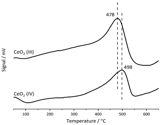 From the TPR profiles shown in Figure 8, only one main reduction peak was observed for both catalysts. This peak occurred at similar temperatures for both catalysts, 478 °C for CeO2 (III) and 498 °C for CeO2 (IV). CeO2 has two main types of reduction features, these are the reduction of surface species and the reduction of bulk lattice species [38]. Bulk reduction occurs at temperatures above 700 °C, whilst surface reduction occurs around 500 °C, therefore, the features present in the TPR profiles relate to the reduction and removal of oxygen species from the catalyst surface. Table 2 shows the H2 consumption normalised for surface area and mass for both catalysts. Both catalysts exhibit good redox ability; however, the CeO2 (III) catalyst had a higher H2 consumption normalised for surface area. This factor, in combination with the lower temperature peak for the surface reduction, suggests CeO2 (III) had a greater extent of surface reduction, and that reduction was slightly more facile compared to CeO2 (IV). These differences between CeO2 (III) and CeO2 (IV), could possibly arise as a result of different structures, identified by SEM, originating from the different synthesis precursors and the subsequent transformation into the CeO2 catalysts.