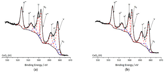 X-ray photoelectron spectra of Ce 3d region for (a) CeO2 (IV) and (b) CeO2 (III) catalysts, where fitted peaks refer to Ce3+ (blue) and Ce4+ (red) states.