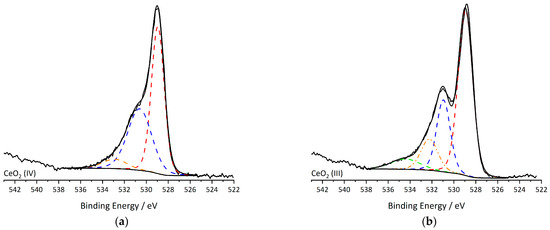 Catalytic activity may also be influenced by the surface oxygen species. Figure 10 shows the fitted O 1s core-level spectra for both catalysts. Two distinct oxygen species/environments can be extracted from the spectra, which we ascribe as Oβ (531 eV) and Oα (529 eV) states, reported to be characteristic of defect oxygen and lattice oxygen species respectively [37,41]. There is some controversy on the labelling of the Oβ region; it is thought that this region could also relate to the presence of hydroxyl and carbonate oxygen species [37]. However, some researchers have linked it to the appearance of low co-ordination oxide ions [41,42]. As a result, the species represented by the Oβ region have been referred to as surface oxygen defect sites. The ratio of Oβ/Oα shown in Table 3 indicates the CeO2 (IV) catalyst has a higher proportion of surface oxygen defect sites compared to the CeO2 (III) catalyst, which is self-consistent with the higher quantity of Ce3+ on the surface determined by XPS analysis of the Ce 3d region. In contrast, data acquired by Laser Raman spectroscopy showed little difference in defect concentration between the catalysts and suggests the defects are highly localised in the near surface region, due to the surface sensitivity of XPS, and the bulk sampling of Laser Raman.