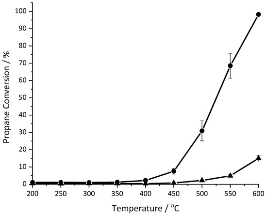 Catalyst activity for propane total oxidation in the presence of water vapour: (Circle) CeO2 (IV) and (Triangle) CeO2 (III). Conditions: 5000 ppm propane in air, GHSV = 45,000 h−1, 5% Water Saturation.