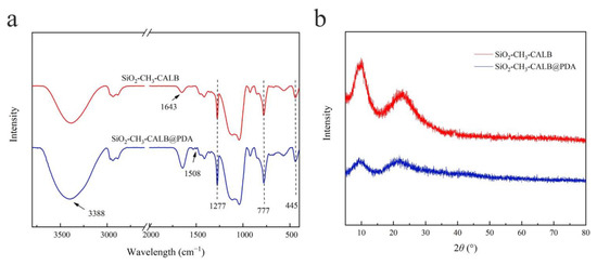 Figure 1a shows a FTIR spectral comparison of SiO2–CH3–CALB and SiO2–CH3–CALB@PDA. The adsorption peaks at 777 cm−1 and 445 cm−1 corresponded to the Si−O−Si group [29]. The band at 1277 cm−1 was assigned to the characteristic peak of Si–CH3, which proved that MTMS successfully deposited a methyl polymer layer on the silica surface. Other bands, at 3388 cm−1 and 1643 cm−1, belonged to the stretching and bending vibrations of −OH [30]. After modification by polydopamine, the vibration absorption peak at 3388 cm−1 was significantly enhanced and widened, which was related to the catechol composition of polydopamine [31]. In addition, SiO2–CH3–CALB@PDA showed a peak at 1508 cm−1, which was ascribed to the bending vibrations of indolequinone groups [32]. The XRD patterns of SiO2–CH3–CALB and SiO2–CH3–CALB@PDA are illustrated in Figure 1b. There was a relatively wide peak at 2θ = 22°, which is characteristic of amorphous silica [33]. The peak at 2θ < 10° was due to the siloxane network and the xerogel’s structure, composed of ordered organic layers [34]. After modification by polydopamine, the intensity of the characteristic peak at 10° became weak, implying the microstructure of SiO2–CH3–CALB had changed due to the uniformly distributed deposition of polydopamine within the structure of the xerogel [35]. These results indicate that a polydopamine coating formed on the silica xerogel through self-polymerization.