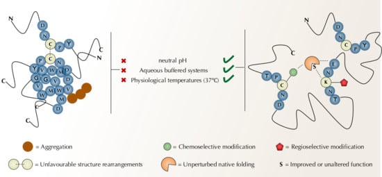 To retain enzymatic function, chemical modifications of proteins require a tight control over the reaction conditions. Modifications must proceed in aqueous buffered systems and organic solvents should be used with discretion to avoid interfering in protein folding. For the same reasons, pH should be kept near neutrality (6.0 to 8.0) and temperatures below 37 °C. Stoichiometry and concentration are also an issue, as proteins tend to aggregate and thus, should be handled at the µM range (or less) [29,30,31].