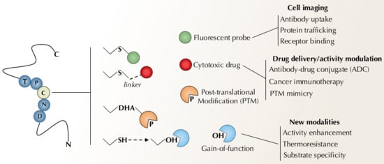 Thiol labeling chemistry has been primarily used in the development of protein-based therapeutics as protein-drug conjugates (e.g., ADCs) and protein-polymer conjugates (e.g., PEGylated proteins) [54,80]. However, recent examples of enzymes modified at cysteine residues provide good evidence towards the utility of this canonical residue as a reactive handle for enzyme functionalization.