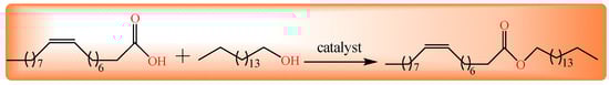 Wax esters are long-chain esters of alcohols and fatty acids with more than 12 carbon atoms [1]. Due to their non-toxic properties, biodegradability and excellent wetting behaviors in interfaces, wax esters (including solid wax esters and liquid wax esters) have been applied in the cosmetic, pharmaceutical, and lubricant industries [2,3,4,5]. Natural sources of liquid wax esters range from animals to plants, such as sperm whales and jojoba oil [6]. After the global ban to stop whaling, jojoba oil became the primary natural source for liquid wax esters [7]. However, the main limitations to the use of jojoba oil are its cost and availability [8]. Therefore, it is highly desirable to synthesize liquid wax esters as jojoba oil analogues for various industry applications.