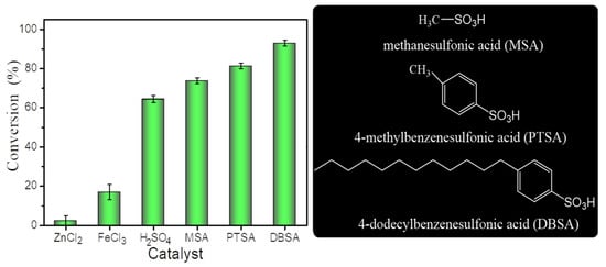 To study the synthesis of unsaturated wax esters (liquid wax esters), esterification of cetyl alcohol with oleic acid (purity 84.4%) prepared from high-oleic sunflower oil was selected as the model reaction and various homogeneous acid catalysts were evaluated (Figure 1). As shown in Figure 2, six acidic homogeneous catalysts were used to promote the esterification of oleic acid and cetyl alcohol to synthesize liquid wax ester (cetyl oleate) at 40 °C. The catalytic efficiency of Lewis acid catalysts (ZnCl2 and FeCl3) was much lower than that of Brønsted acid catalysts, including H2SO4, methanesulfonic acid(MSA), p-toluenesulfonic acid (PTSA), and 4-dodecylbenzenesulfonic acid (DBSA). The different results for the four sulfonic acid catalysts (H2SO4, MSA, PTSA, and DBSA) can be attributed, at least in part, to their molecular structures. Compared with MSA and PTSA, the long hydrophobic aliphatic chains in the molecular structure of DBSA increase its hydrophobicity, so the conversion rate increased significantly at such a mild temperature (40 °C). This observation was consistent with previous reports [13,15].