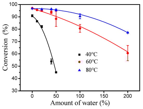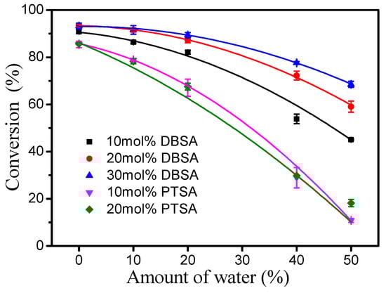 Esterification is a reversible reaction process and one of its products is water, so that water in reactants may affect esterification. Therefore, the effect of water on the esterification of oleic acid (from high-oleic sunflower oil) in the presence of DBSA and PTSA was evaluated under a reaction temperature of 40 °C, a molar ratio of 1.3:1 fatty acid to alcohol and a reaction time of 4 h (Figure 4). In general, the higher the initial water proportion in the reaction mixture, the slower the reaction rate. Interestingly, as the amount of DBSA increased (10–30 mol%), the inhibitory effect of water on the reaction decreased. For comparison, the inhibitory effect of water on the reaction did not increase with an increase in the amount of PTSA from 10 to 20 mol%. This phenomenon may be due to the higher solubility of PTSA in water than DBSA, which is an amphiphilic molecule [17].