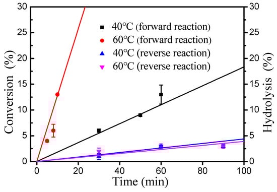 As shown in Figure 5, the inhibitory effect of water to esterification decreased significantly with increasing reaction temperature (40–80 °C). Importantly, introducing an extra 50% water had no effect on the esterification of oleic acid and cetyl alcohol at 80 °C. Thus, the rate of the hydrolysis of wax ester under water is very important for esterification [18]. The initial rates of esterification at 40 and 60 °C were evaluated respectively (Figure 6). At 60 °C, it was found that the forward reaction was 32-fold faster than the reverse reaction (hydrolysis of ester) and 7.1-fold faster than at 40 °C (forward reaction at 60 °C, 1.28 M min−1; reverse reaction at 60 °C, 0.04 M min−1; forward reaction at 40 °C, 0.18 M min−1; reverse reaction at 40 °C, 0.04 M min−1). These results clearly demonstrate that the increase in temperature is favorable for the positive reaction of esterification.