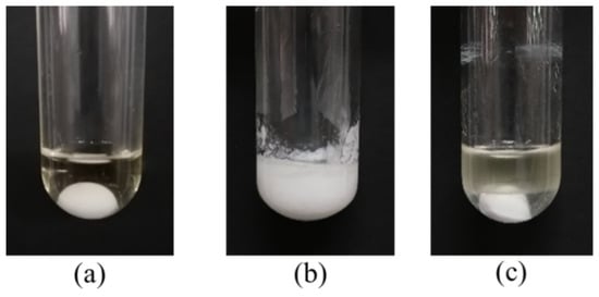 Phenomenon of DBSA-catalyzed esterification of oleic acid with cetyl alcohol. (a): no water added, (b): 100% water added, (c): saturated CaCl2 solution added. Reaction conditions: a reaction temperature of 60 °C, DBSA 10 mol% DBSA, a molar ratio of 1.3:1 oleic acid to alcohol, a reaction time of 4 h and 100 wt% water of cetyl alcohol.
