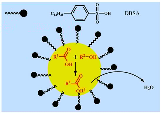 - Manabe, K.; Sun, X.M.; Kobayashi, S. Dehydration reactions in water. Surfactant-type Brønsted acid-catalyzed direct esterification of carboxylic acids with alcohols in an emulsion system. J. Am. Chem. Soc. 2001, 123, 10101–10102. [Google Scholar] [CrossRef] [PubMed]