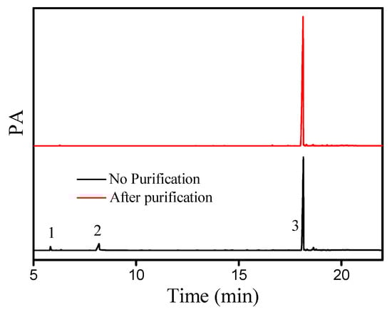 The gas chromatogram (GC) of the liquid wax ester (cetyl oleate) synthesized under optimal conditions is shown in Figure 9. In the presence of DBSA, no side products were observed after the esterification of oleic acid and cetyl alcohol. After purification by silica gel column chromatography (Figure 9), the cetyl oleate could be obtained as a light-yellow liquid, with a yield of 92.1% and a purity of 99%. Additionally, the chemical structure of pure cetyl oleate was identified by NMR (for more details, see Section 3.6).