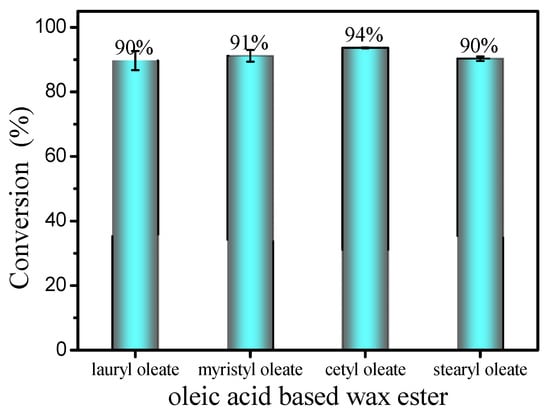 The substrate scope for wax esters production was investigated under optimum reaction conditions (Figure 10). Esterification of oleic acid (99% purity) and various long-chain fatty alcohols (C12–C18) was conducted. Interestingly, esterification shows excellent conversion rates (90.0–94.0%) for various long-chain fatty alcohols, including lauryl alcohol, myristyl alcohol and stearyl alcohol. After purification by silica gel column chromatography, various liquid wax esters, including lauryl oleate, myristyl oleate and stearyloleate, were obtained with a purity of up to 99%.