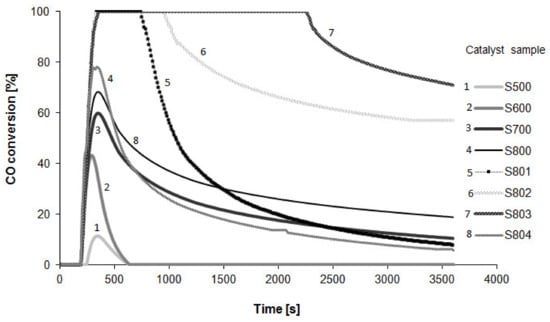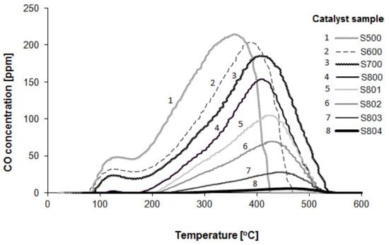 The profiles reveal that the carbon monoxide oxidation over the Pt/Al2O3 catalyst at RT occurred significantly only after its very high temperature reduction. The highest activity was recorded for the sample reduced four times at 800 °C (sample S803). According to the above considerations, the areas under profiles are proportional to the CO2 volume arising for 3600 s of carbon monoxide oxidation.