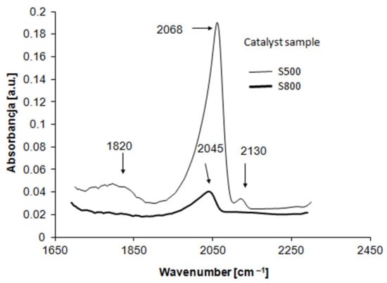For the S500 sample, both linearly [Pt-CO (2068 cm−1)] and bridge [Pt-(2CO) (1820 cm−1)]-bonded carbon monoxide was detected. In addition, a very small peak at 2130 cm−1 was also recorded. This peak is usually assigned to CO adsorption on the oxidized form of platinum atoms [36]. Comparing the peaks areas, it can be stated that the percent concentration of the bridge-bonded CO is ca. 11%. It is worth emplacing that the difference between the DCO and DO2 dispersion values is equal to 11.5% (Table 1). Thus, one can conclude that FTIR and CO chemisorption results for S500 sample are in line.