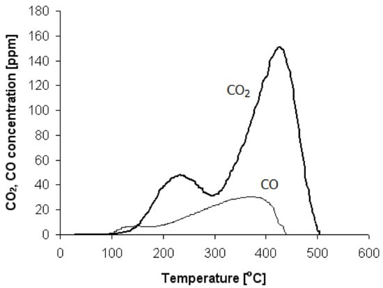 The TPD-CO profile for the S500 catalyst sample is shown in Figure 4 (curve labeled as CO). Only two small and broad peaks with maxima at 110 °C and 380 °C, respectively, can be observed. The volume of desorbed CO (0.005 cm3/gcat) does not correspond to the result presented in Table 1 for adsorbed CO (0.814 cm3/gcat). To explain this phenomenon, it is assumed that the process of CO desorption is also connected with the formation of CO2. Carbon dioxide can arise as a product of the Boudouard reaction:
