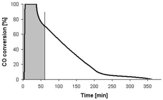The outlet gas mixture was analyzed using a Fuji infrared gas analyzer. The samples after reduction in H2 at the given temperature were flushed with ultra-pure (99.9999%) nitrogen and then cooled to room temperature (RT). The aim of this process was to remove the adsorbed H2. After cooling and temperature stabilization at 23 °C (±3), nitrogen was changed for the reaction gas mixture and concentrations of CO and CO2 behind the reactor were recorded. Figure 7 shows an illustrative CO conversion profile, which was derived during CO oxidation over 360 min at room temperature over Pt/Al2O3 catalyst (S803 sample).