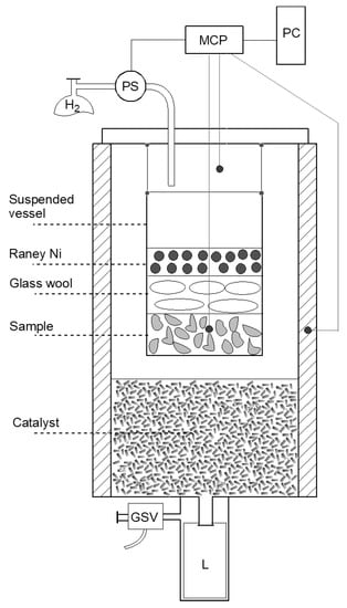 Pressure reactor. Outer part (500 cm3) is filled with catalyst and fitted with gas-sampling valve (GSV) and a cooled, calibrated glass vessel at the bottom of the reactor (L) for liquid product collection. Inner part (90 cm3) is suspended inside the outer reactor part and contains the sample and Raney nickel layer. PS—pressure sensor, MCP—measuring control panel; hatched areas—electric vertical oven; black dots: thermocouple for measuring the temperature in the center of the sample, control thermocouple and thermocouple measuring the gas temperature.