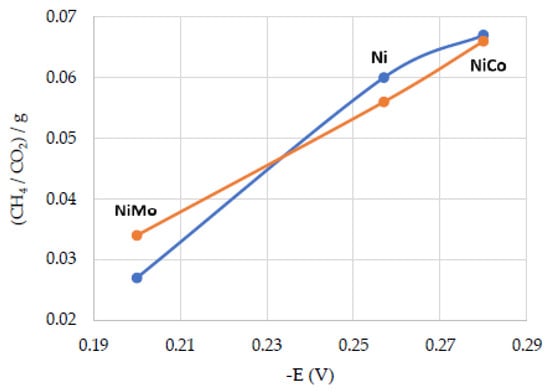 The dependence of the catalyst efficiency on the reduction potential of the catalytic metal is shown in Figure 2, where the catalyst efficiency is expressed as the CH4/CO2 ratio in the resulting gas (Table 5 and Table 6) related to 1 g of the catalytic metal (Ni) or metals (Ni, Co or Ni, Mo); the reduction potential of the catalytic metal here is the standard reduction potential (-E) of the influencing metal, i.e., in the case of the Ni-catalyst it is Ni, in the case of NiCo it is Co, and for NiMo it is Mo. The standard reduction potentials have been taken from the handbook [18].