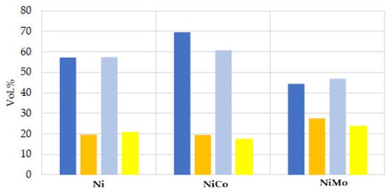 A similar conclusion can be reached when assessing the activity of catalysts according to methane production. Figure 3 (based on data in Table 5 and Table 6) shows that for both types of the input biomass, the highest methane production was recorded in the case of the NiCo catalyst. The Ni catalyst showed a slightly lower activity and the NiMo catalyst was the least effective.