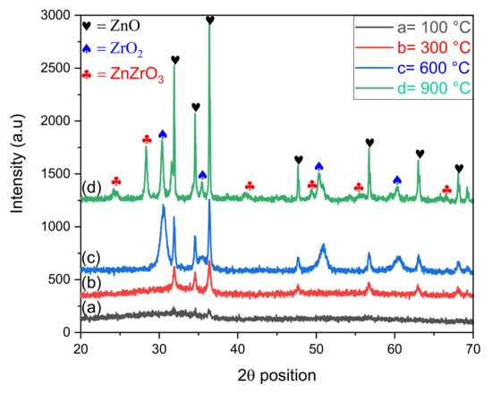 The XRD diffractograms of ZnO-ZrO2 NC calcined at 100, 300, 600, and 900 °C are given in Figure 1, which shows that the diffraction spectrum of ZnO-ZrO2 calcined at 100 °C has no peak and are suggested to be amorphous. After increasing the temperature from 100 to 300 °C, the diffraction bands appeared in the spectrum at 2-theta position with corresponding hkl planes are 31.90 (100), 34.52 (002), 36.35 (101), 47.71 (102), 56.73 (110), 63.01 (103), and 68.08 (112). All these peaks, along with hkl planes, were found to be similar with those reported in the JCPDS card 01-075-0576, assigned to hexagonal-shaped ZnO with space group P63mc and space number 186. The crystallite size calculated with respect to the most intense diffraction band at 36.35° was 35.40 nm with a lattice strain of 0.313 percent. The length of three coordinates, i.e., a, b, and c, of orthorhombic ZnO was 3.2427, 3.2427, and 5.1948 Ǻ along with 90° of alpha and beta, and 120° of gamma, respectively. No diffraction band was observed for ZrO2 in the XRD pattern of the ZnO-ZrO2 calcined at 300 °C, depicting the amorphous nature of ZrO2. The results were consistent with the previous data, where amorphous ZrO2 was reported [15]. The diffraction peaks in the spectrum obtained for ZnO-ZrO2 calcined at 600 °C at a 2 theta positions were 31.90, 34.52, 36.35, 47.71, 56.73, 63.01, and 68.08, with corresponding miller indices (100), (002), (101), (102), (110), (103), and (112), respectively. All these bands were matched with reference card 01-075-0576 and were assigned to the hexagonal geometrical shape of ZnO (having the same lattice parameters as stated above) with a space group of P63mc and space number 186. Another set of diffraction peaks at the 2-theta position, along with hkl values, were 30.44 (101), 35.46 (110), 50.33 (112), and 60.51 (211), corresponding to the JCPDS card No. 01-079-1771. These bands confirmed the tetragonal geometry of ZrO2 with the space group and number of P42/nmc and 137, where a and b coordinates are of 3.5916 Ǻ while coordinate c is equal to 5.1790 Ǻ, where all the three angles are 90°. The crystallite size calculated for ZnO and ZrO2 crystals were 70.90 and 23. 30 nm, with 0.157 and 0.563 percent lattice strain, respectively. The XRD pattern of ZnO-ZrO2 calcined at 900 °C possessed similar diffraction bands at almost the same 2-theta positions with corresponding hkl planes explains the hexagonal and tetragonal geometrical shape of ZnO and ZrO2. The crystallite size for the ZnO and ZrO2 in the ZnO-ZrO2 sample calcined at 900 °C 105.83 and 41.80 nm with 0.105 and 0.317 percent imperfection in the crystals, respectively. A third set of Bragg’s reflections appeared in the diffractogram of ZnO-ZrO2 calcined at 900 °C at 24.13, 28.31, 40.91, 49.35, 55.46, and 66.52 were found to be similar, with bands reported in reference card No. 00-032-1482 assigned to an unknown crystal system of ZnZrO3 with a crystallite size of 59.42 nm and lattice strain of 0.239 percent. The three separate sets of diffraction bands in the spectra of ZnO-ZrO2 calcined at 600 and 900 °C suggest the formation of hetero-structures. The intensity of diffraction peaks was seen to increase with increasing calcination temperature, revealing that the degree of crystallinity increased along with crystallite sizes. However, no shift was seen in the peak positions with increasing calcination temperature, suggesting that no phase transformation occurred.