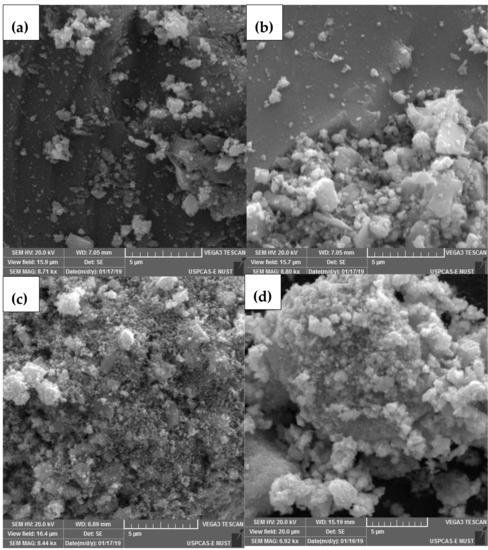 SEM Micrographs of ZnO-ZrO2 NC calcined at different temperature ((a) = 100 °C; (b) = 300 °C; (c) = 600 °C; and (d) = 900 °C.).