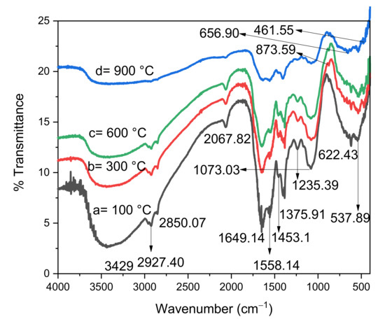 The wide band centred at 3429 cm−1 indicates the stretching vibration of the OH group, whereas the two peaks at 1649.14 and 1558.14 cm−1 indicate the bending vibrations of adsorbed water molecules and OH groups on the surface, respectively, in the FTIR spectra of ZnO-ZrO2 NC calcined at 100, 300, 600, and 900 °C, as shown in Figure 3 [18,19]. The intensity at 1435.10 cm−1 was assigned to the carbon–carbon stretching of organic compounds, whereas the bands at 1235.39 and 1073.03 cm−1 indicate the bending vibrations of C–O–C and overlapping of C–O groups, respectively, which might have been present in the sample due to the use of plant material in the synthesis [13,20]. The strength of the above peaks decreased as the calcination temperature increased from 300 °C to 900 °C, which is due to the fact that water and other organic molecules evaporate at higher calcination temperatures. The bending vibrations of M–O–H bonds found on the surface groups were responsible for the band at around 1358.02 cm−1 [16]. The vibration modes of Zr–O–Zr and O–Zr–O appeared at 873.59 and 656.90 cm−1, respectively [16]. The wavenumber at 537.389 cm−1 is associated with the Zn–O bond [18]. The band of 447.51 cm−1 confirmed the formation of crystalline ZnO–ZrO2 NC [20].