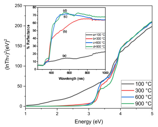 We calculated the band gap energy, which was the lowest energy required for electron excitation from the valance band to the conduction band [21]. The DRS spectrum of ZnO-ZrO2 NC shows two absorption edges instead of one, suggesting the formation of ZnO-ZrO2 heterojunction (Figure 4), as was also confirmed by XRD and FTIR analysis, where individual bands were seen for ZnO and ZrO2. The DRS spectra for all calcined ZnO-ZrO2 samples shows an absorption band in the range of 353 to 370 nm attributed to the excitation of electron from valance band to conduction band (O2p→Zn3d). The spectrum also shows another absorption edge appeared at a lower wavelength in the range of 293–303 nm due to the presence of Zr in the form of Zr4+ and the excitation of an electron from the valance band (O2p) to the conduction band (Zr4d). The absorption edges for ZnO and ZrO2 in the ZnO-ZrO2 samples calcined at 100, 300, 600, and 900 °C were found to be in close agreement with reported data [14]. The presence of two edges can be seen for ZnO-ZrO2 materials and a band gap can also be determined through a Tauc plot. All the calcined ZnO-ZrO2 NC revealed higher transmittance in the visible region and lower transmittance in the UV region [22,23]. The band gap energy for ZnO in ZnO-ZrO2 heterojunction calcined at 100, 300, 600, and 900 °C were 3.31, 3.36, 3.38, and 3.29 eV, respectively. Similarly, the band gap energy for ZrO2 in ZnO-ZrO2 heterojunction calcined at 100, 300, 600, and 900 °C were 3.96, 3.99, 3.97, and 4.01 eV.