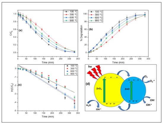 In the presence of a stimulated solar light source, ZnO-ZrO2 NC destroys Rhodamine 6G. When photons of light reach the surface of the catalyst, an outermost electron is activated. The excited electron oxidizes the oxygen in the reaction mixture, forming an oxygen anion radical. To breakdown the dye, the oxygen ion radical interacts with Rhodamine 6G and transforms it into a simpler organic molecule [21,25]. A schematic diagram for the degradation of Rhodamine 6G is shown in Figure 6d. When the ZnO-ZrO2 NC is activated by solar light, electrons migrate from the valence bands of both oxides to the conduction band, forming electron–hole pairs. Because the energy levels of zinc oxide fit nicely within the band gap of ZrO2, electrons from the conduction band of zirconium dioxide may readily migrate to the conduction band of ZnO [26]. On the other hand, holes move from the valence band of ZnO to the valence band of ZrO2, potentially reducing electron–hole pair recombination in ZnO-ZrO2 NC. These e− and h+ radicals react with oxygen and water to create (OH•) radicals, which may quickly oxidize Rhodamine 6G due to their high reactivity and production of water and carbon dioxide [27].