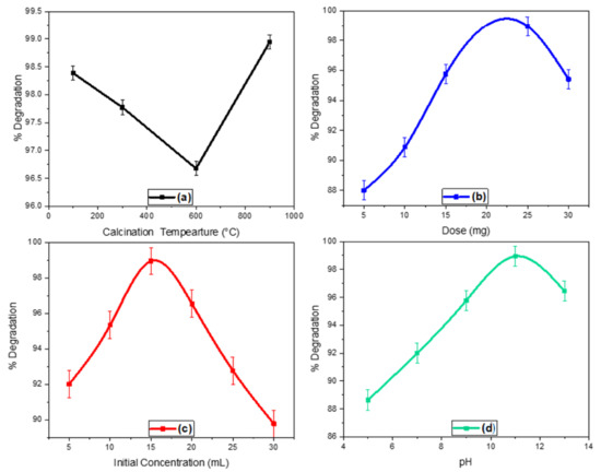 The parameters like initial concentration, catalyst dose, pH, and calcination temperature greatly affect the photocatalytic activity of the ZnO-ZrO2 NC and obtained data is depicted in Figure 7a–d. This effect is briefly explained below: