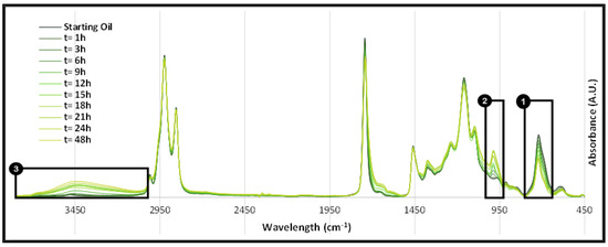 A qualitative approach to the grape seed oil epoxidation kinetic based on the FTIR spectra of GSO at different reaction times is shown in Figure 3.