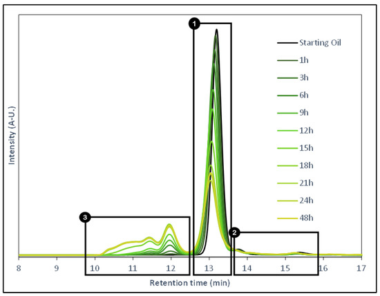 GPC chromatograms of the epoxidized products through time. Three depicted regions (1: Triglycerides, 2: Low molecular weight products, 3: High molecular weight products).