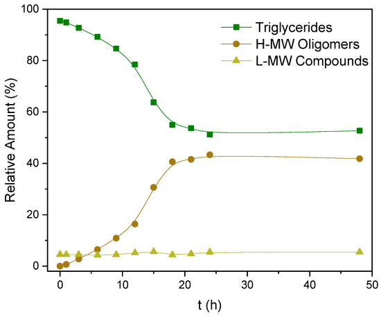 As shown in Figure 6, the relative concentration of low-molecular-weight compounds remains practically constant at considerably low values and yet the concentration of high-molecular-weight products increases in direct proportion to the way in which the triglycerides decrease.