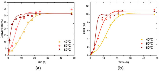 Once primary characterization of the epoxidation products is concluded, the influence of temperature on the reaction kinetics was studied over the temperature range from 40 to 60 °C. The values of conversion and epoxide yield are presented in Figure 7.
