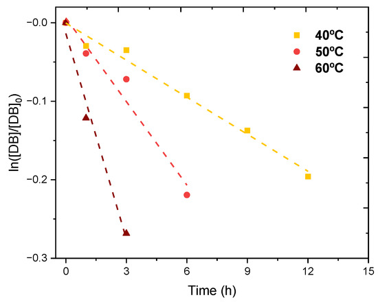 Equation (6) is plotted in Figure 8 taking into consideration that the measured parameter for the concentration of double bounds in this work is the iodine value, and assuming that it is directly proportional to it, and so ln([DB]/[DB]0) = ln(IV/IV0).