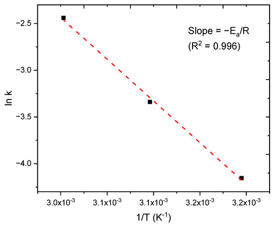 High R2 values for the three temperature series imply a really good fitting to a linear adjustment of the experimental data and confirm that the reaction follows pseudo first-order kinetics in the initial stages, when the rate of reaction control is the controlling step of the process.