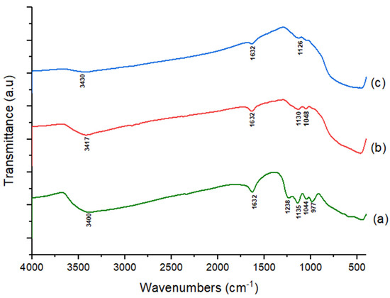 FTIR spectra of (a) TS-3-400, (b) TS-3-500, (c) TS-3-600.