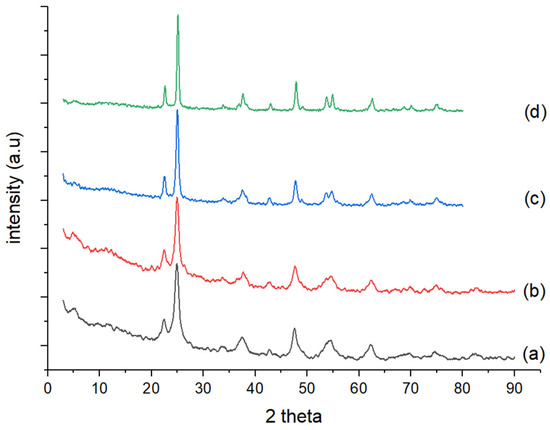 Diffractogram of (a) TS0, (b) TS-3-400, (c) TS-3-500, and (d) TS-3-600.