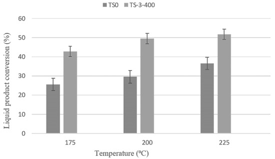Figure 7 presents the data of conversion percentage on dehydration reaction using catalysts TS0 and TS-3-400 at various temperatures of 175, 200, and 225 °C. The liquid products conversion using catalyst TS-3-400 at various temperatures was higher compared to catalyst TS0. This was due to the addition of sulfate to titania catalyst increased the number of Brønsted acid and Lewis acid sites in catalysts, where acid strength was the most influential factor in determining catalytic activity in ethanol dehydration reaction [37]. Strong acid sites influenced improved the catalytic activity of the SO4/TiO2 catalyst.