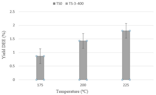 The results of DEE levels in ethanol dehydration reactions with TS-3-400 catalysts were compared to results obtained from TS0 catalyst shown in Figure 8. Diethyl ether levels were 0% in the catalytic reaction using TS0 catalyst at a temperature of 175, 200, and 225 °C. The difference in the results demonstrated that the reaction temperature and treatment of the catalyst were critical in the ethanol dehydration reaction. While DEE levels in the catalyst of TS-3-400 increased as the reaction temperature increased. This indicated that the ideal temperature for ethanol dehydration to diethyl ether was 225 °C with a DEE content of 1.72%. According to the Arrhenius equation, rising temperatures could increase ethanol conversion. From the equation, an increase in temperature would increase the constant reaction speed, thereby increasing the reaction rate [38].