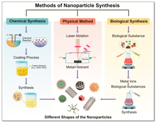 Nanotechnology has evolved as a highly technical research arena with potential applications in all spheres of life. The term “nano” has been derived from the Greek for “dwarf.” With a clear idea of the extremity of something in a nano, a nanoparticle can be defined as particles that have at least one dimension below 100 nm [1]. Several bulk materials show completely different properties when they are studied on the nanoscale. One known reason for this phenomenon is their higher surface-to-volume aspect ratio. For different nanoparticles, this can result in a variety of characteristics. For example, the higher aspect ratio of silver nanoparticles allows them to have increased efficacy in antibacterial properties. Consequently, silver nanoparticles can have diverse applications in cosmetics, packaging, electronics, coatings, and biotechnology [2,3]. A unique property of nanoparticles is that they have the ability to combine or form a solid at lower temperatures without melting. This property helps to achieve improved coatings on capacitors and other electronic components. Nanoparticles are also transparent, which allows them to be utilized in packaging, coating, and cosmetics (e.g., scratchproof eyeglasses, crack-resistant paints). When metallic nanoparticles are attached to single-stranded DNA, they can travel through the bloodstream and confine any target organ. This characteristic can be exploited in medical diagnostics, therapeutics, and other biomedical applications. Due to their significant potentials, nanoparticles must be further studied to find unexplored uses in everyday life [4].