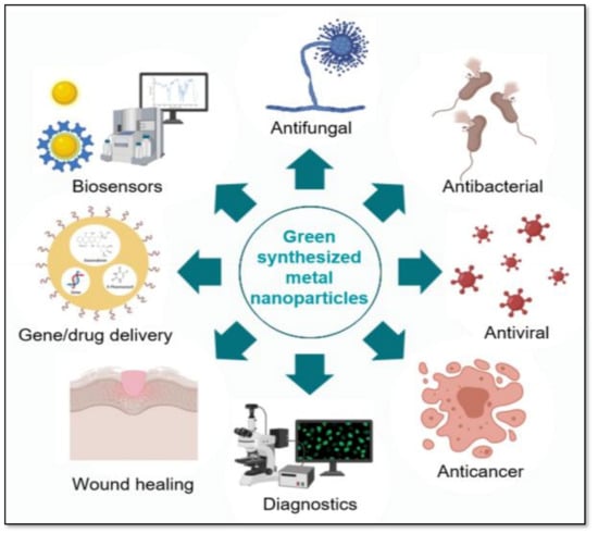 Biologically synthesized nanoparticles have been extensively used in various applications (Figure 5). Silver and gold nanoparticles were also found to generally be used as antimicrobial agents against several microorganisms. They also possess anti-cancerous, anti-viral, antimalarial, and antifungal activities [1,3]. In addition to biomedical applications, they are also used in electronics, optics, cosmetics, coatings, sensing devices, therapeutics, environmental health, and chemical industries. [12]. They have appeared as a new drug delivery system for drug and gene transportation. A study reported that silver nanoparticles with a different shape can show varied antimicrobial activity due to their different surface area and active faces [147]. Mishra et al. [148] reported the synthesis of gold nanoparticles mediated by Penicillium brevicompactum and evaluated its potential role against mouse mayo blast cancer cells. Chauhan et al. [149] reported the synthesis of gold nanoparticles using Candida albicans and evaluated its anticancer potential against liver cancer cells. In another study, silver nanoparticles synthesized from Stoechospermum marginatum were used to evaluate the antibacterial activity against Enterobacter faecalis. It was found to have a higher antibacterial activity compared to tetracycline, whereas, in the case of E. coli, no positive effect was observed [124]. Soni and Prakash [150] used Aspergillus niger for the synthesis of gold nanoparticles and evaluated its anti-larval activity against Anopheles stephensi, Aedes aegypti, and Culex quinquefasciatus. It was observed that nanoparticles were more effective against C. quinquefasciatus. Sunkar and Nachiyar [151] reported the synthesis of silver nanoparticles from Bacillus cereus. It was found to have antibacterial activity against S. aureus, K. pneumonia, E. coli, S. typhi, and P. aeruginosa [151]. Abdeen et al. [152] reported the synthesis of silver and iron nanoparticles using Fusarium oxysporum and evaluated their antimicrobial properties against E. coli, Bacillus, P. aeruginosa, K. pneumoniae, Proteus vulgaris, and Staphylococcus sp. A study reported the synthesis of silver nanoparticles using Ulva lactuca and found that at low concentration, it was able to inhibit the growth of Plasmodium falciparum [153]. A study reported the synthesis of selenium nanorods using Streptomyces bikiniensis and evaluated their potential anticancer activity against human cancer cells [154]. Borse et al. [155] tested the anticancer activity of platinum nanoparticles against MCF-7 and A431 cell lines, which were synthesized from Saccharomyces boulardii. Mohamed et al. [156] synthesized iron nanoparticles using Alternaria alternate and tested their antibacterial properties against E. coli, B. subtilis, S. aureus, and P. aeruginosa. It was found that iron nanoparticles possess the maximum inhibition of B. subtilis. In another study, Streptomyces cyaneus was used to synthesize gold nanoparticles and to investigate their anticancer activity against liver and breast cells. It was found that gold nanoparticles stimulated mitochondrial apoptosis, DNA damage, and induced cytokinesis arrest [157]. A study reported the synthesis of gold and silver nanoparticles using Streptomyces sp. and evaluated its potential antibacterial activity against Salmonella infantis, S. aureus, Bacillus subtilis, Proteus mirabilis, K. pneumoniae, P. aeruginosa, and E. coli [158]. Arya et al. [139] used Botryococcus braunii for the synthesis of copper nanoparticles and evaluated their antimicrobial activity. It was found to show toxicity against E. coli, K. pneumoniae, P. aeruginosa, and S. aureus. Husain et al. [159] reported that the synthesis of silver nanoparticles using cyanobacteria showed potential photocatalytic activity against dye. Dananjaya et al. [160] reported the synthesis of Spirulina maxima-mediated gold nanoparticles and evaluated its cytotoxicity and anticandidal activity. It was found that nanoparticles do not possess any cytotoxicity against cell lines, because they act as potent anticandidal agents. In a study, Escherichia sp. was used to synthesize copper nanoparticles and was utilized for the degradation of azo dye and textile effluent treatment. It was found that 83.90% of the congo red dye was removed and, in textile effluents, there was a significant reduction in electrical conductivity, pH, turbidity, total dissolved solids, total suspended solids, hardness, chlorides, and sulfates compared to nontreated samples [161].