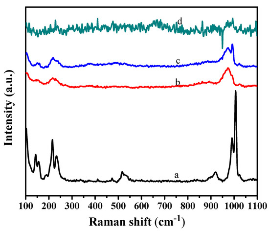 Raman spectra of various samples. (a) C16PW, (b) C16PW/SiO2, (c) C16PW/SiO2-BM, (d) C16PW/SiO2-Fe-BM.