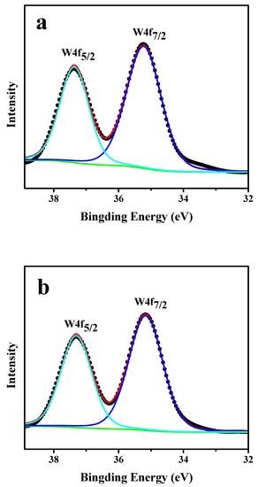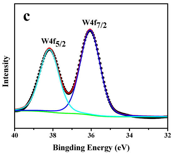 XPS spectra are employed to investigate the effect of ball milling method and Fe3O4 incorporation on the chemical properties on the elements of various samples (Figure 4). For the W 4f core-level spectrum of C16PW/SiO2 (Figure 4a), two peaks at the binding energy of 37.38 eV and 35.23 eV could be found, which was ascribed to W 4f5/2 and W 4f7/2 respectively. For the sample C16PW/SiO2-BM, the peak for the W 4f5/2 and W 4f7/2 could be observed at the same position (Figure 4b), indicating no change on the valence state of tungsten after ball milling. However, for the sample C16PW/SiO2-Fe-BM (Figure 4c), the binding energy for W 4f5/2 and W 4f7/2 was increased to 38.18 eV and 36.03 eV, indicating the electron transfer between Fe3O4 and supported ionic liquid.