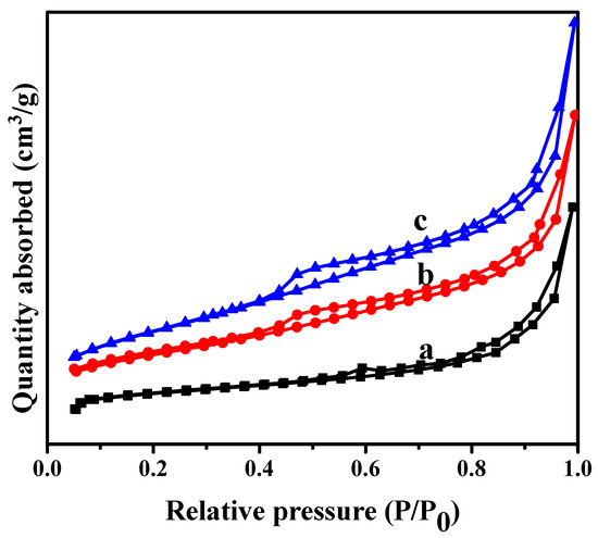 N2 adsorption–desorption isotherms of various samples. (a) C16PW/SiO2; (b) C16PW/SiO2-BM; (c) C16PW/SiO2-Fe-BM.