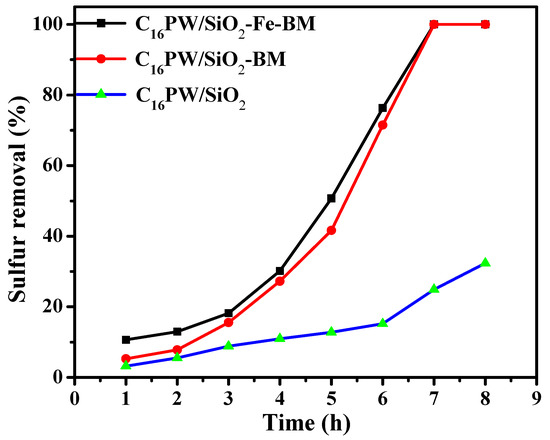 The desulfurization performance of different samples is presented in Figure 6. Under the same reaction conditions, the sulfur removal for C16PW/SiO2, C16PW/SiO2-BM, and C16PW/SiO2-Fe-BM could reach 24.9%, 98.5%, and 99.1%, respectively. It could be found that the ODS performance of the samples was improved after ball milling. Moreover, the desulfurization efficiency was also increased after the incorporation of Fe3O4, which was ascribed to the higher surface area (Table 1).