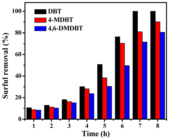 In order to study the desulfurization activity of the sample C16PW/SiO2-Fe-BM toward different sulfur-containing substrates, the typical sulfide DBT and its derivatives (4-MDBT and 4,6-DMDBT) are carried out under the same conditions (Figure 7). For DBT, the desulfurization rate can reach 100% within 7 h. On the other hand, the desulfurization rate toward the aromatic sulfide 4-MDBT and 4,6-DMDBT can reach 90.2% and 80.5% in 8 h, respectively. The difference on ODS performance may be ascribed to the steric hindrance in the sulfur compounds [56]. The steric hindrance of sulfur compounds followed the order: 4,6-DMDBT > 4-MDBT > DBT [57]. Compared to DBT, 4-MDBT and 4,6-DMDBT have one or two more methyl groups on the benzene ring, respectively. Their steric hindrance is greater than that of DBT, making it difficult for sulfur atoms to be oxidized during the reaction process.