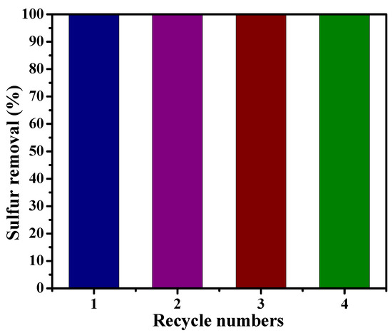 The recycling performance of the catalyst is another important factor in the desulfurization process (Figure 8). The recycling process of the typical sample C16PW/SiO2-Fe-BM was performed as follows: The upper oil phase was decanted directly after the reaction, and the lower catalyst was dried at 50 °C overnight. Afterwards, the next run was evaluated after adding the fresh model oil and air flow. It can be observed that the sulfur removal could still reach 100% after being recycled four times.
