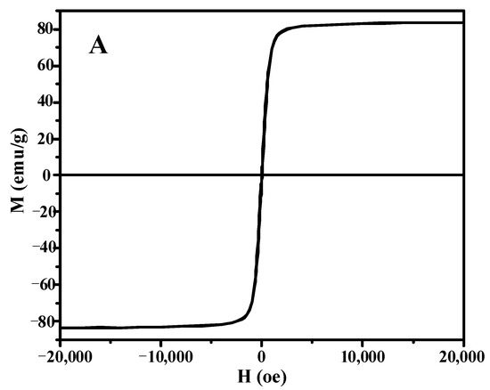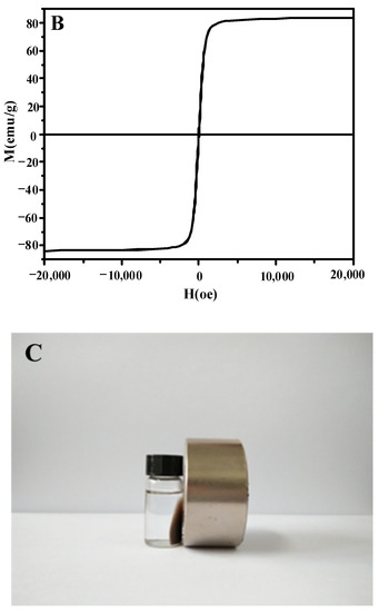 In order to investigate the magnetism of the catalyst, the magnetization of Fe3O4 and C16PW/SiO2-Fe-BM is measured through an external magnetic field at room temperature (Figure 9). As shown in Figure 9A,B, the saturation magnetization of C16PW/SiO2-Fe-BM (0.8 emg/g) is significantly lower than that of Fe3O4 (82 emg/g). This result was attributed to the low content of Fe3O4 and the addition of non-magnetic material (C16PW/SiO2) in the hybrid materials. Moreover, no hysteresis phenomenon was found in Figure 9A, indicating the superparamagnetism of the prepared samples. To further confirm the above results, the separation expriment of the sample in oil is carried out in this study (Figure 9C). It was obviously found that the catalyst could be easily separated from the oil phase through the action of an external magnetic field.